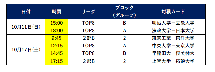 明日10日(土)に予定しております1部リーグTOP8の2試合について、台風14号の接近に伴い、延期とする可能性があることをお知らせします。